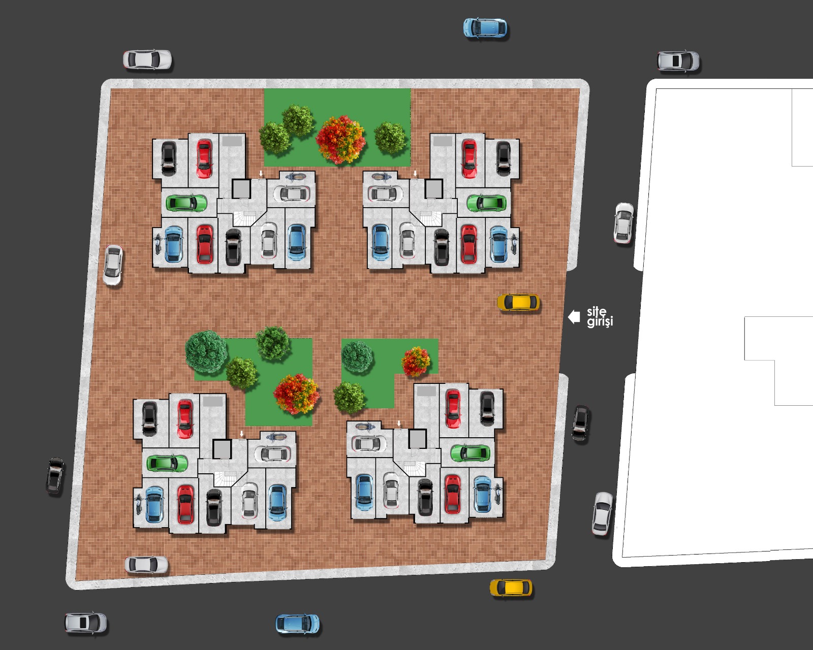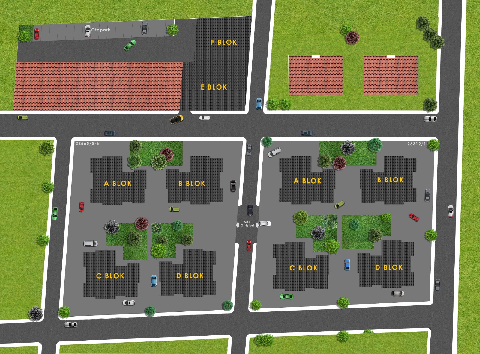 Sosyal Donatılar ve Otopark: Her adanın araç ve yaya girişi ayrı olup site girişlerinde otomatik bariyerler bulunacaktır. Blokların bodrum/zemin katlarında her daire için kapalı otopark (garaj) alanları ve teknik odalar ayrılmıştır.
