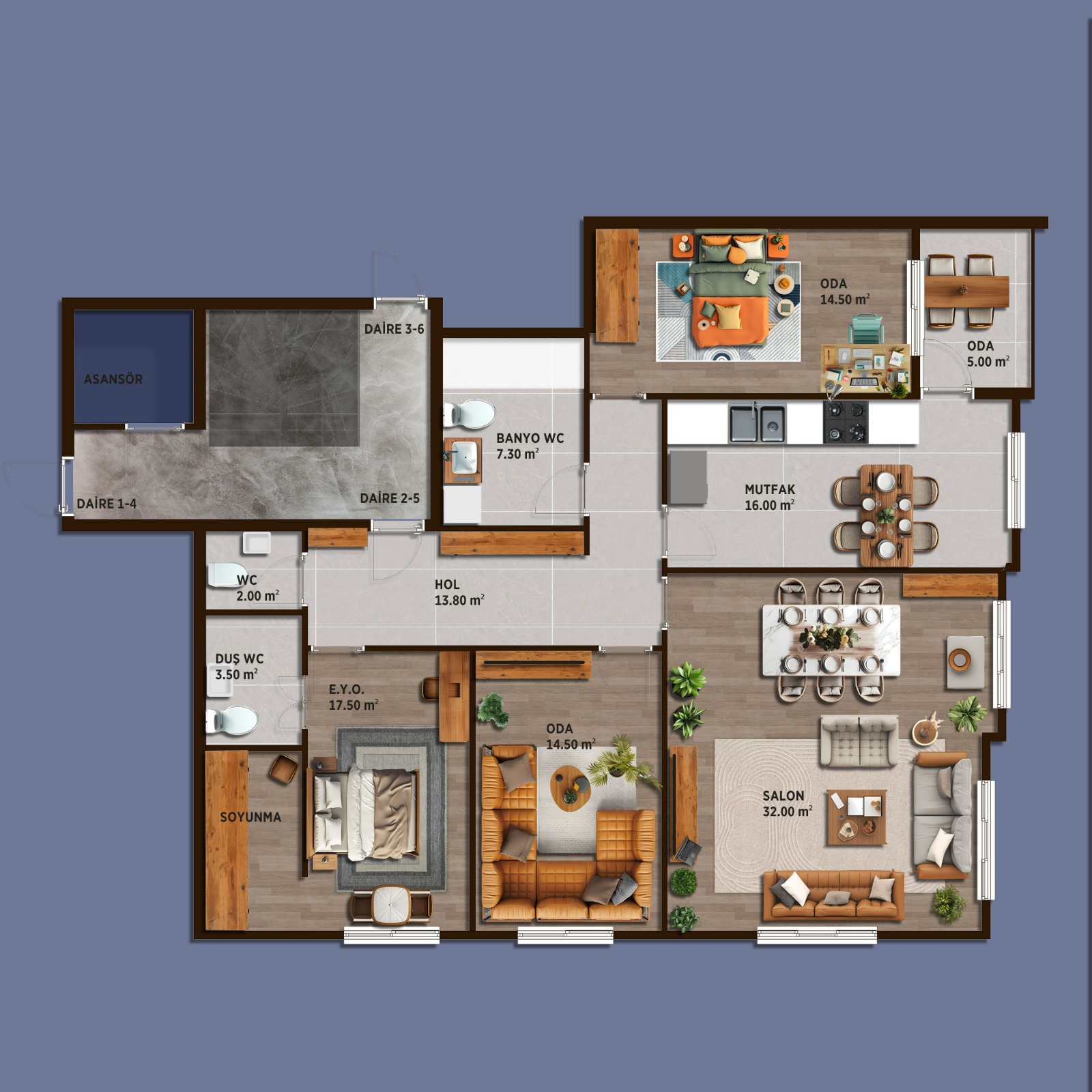 * Daire içlerinde laminat parke, ıslak hacimlerde 1. sınıf seramik, mutfaklarda ise granit veya mermer tezgahlar kullanılmaktadır.
